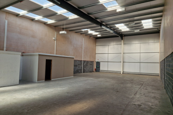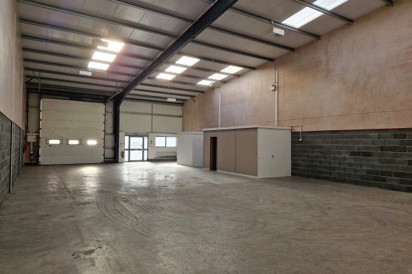 The mid terrace unit is of steel portal frame construction beneath a mono pitched insulated roof with blockwork and profile metal cladding to the elevations. The accommodation offers a regular shaped workshop with an effective eaves height of 5.7m increasing to 6.4m at the rear, a partitioned office and WC.